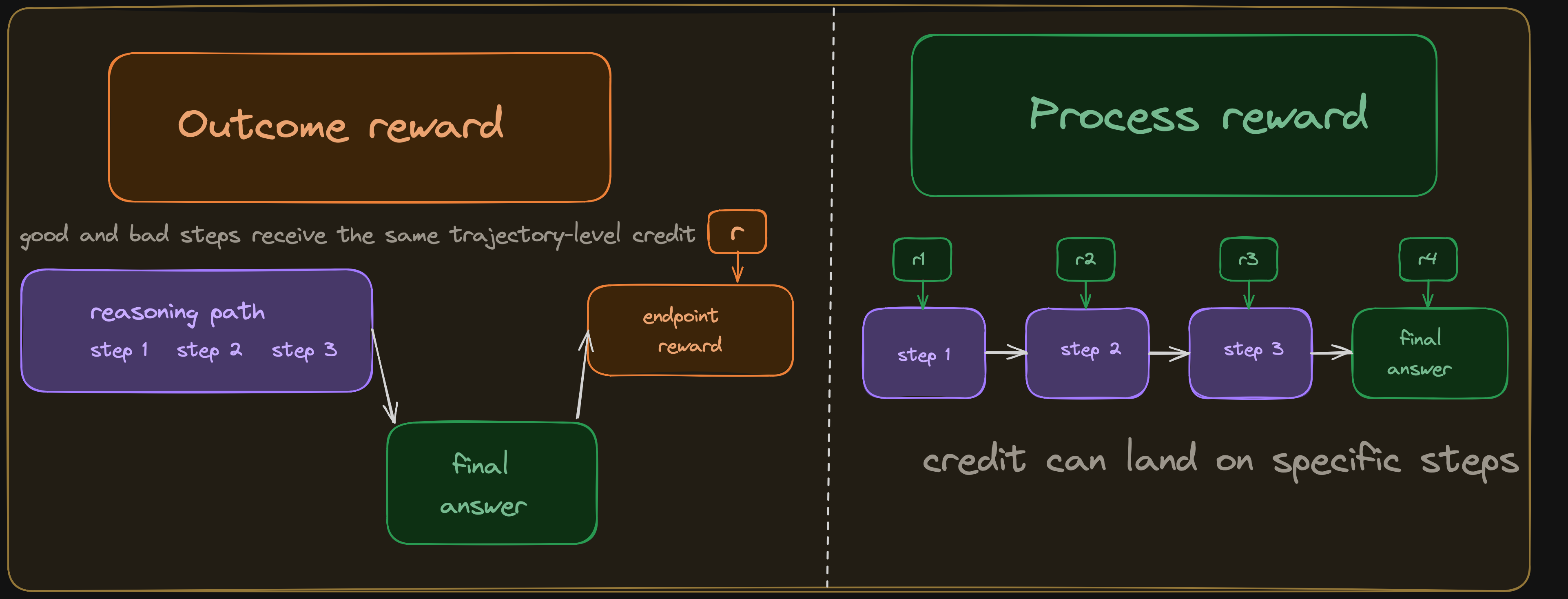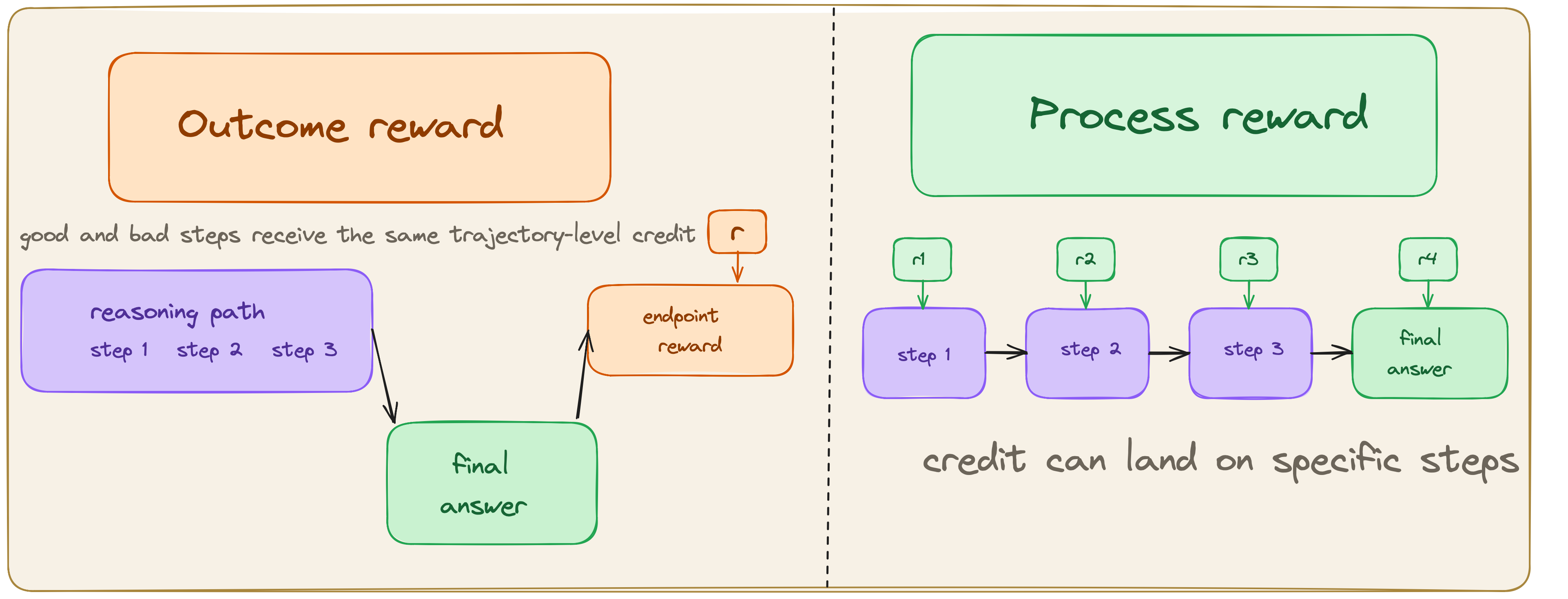 Both scenarios compress distinct kinds of signal. The second is a false negative: correct reasoning is suppressed because the final reported answer is incomplete. The first contains exactly the kind of self-correction we may want the model to learn. However, outcome reward still reinforces the failed factoring attempt and the successful recovery together, even though they should not receive the same effective update. This is one of the main motivations for process supervision. Uesato et al. found that process-based feedback produced substantially cleaner reasoning traces than outcome-based feedback even when final-answer accuracy was similar, and Lightman et al. later showed that process reward models outperform outcome-only reward models on harder math reasoning tasks.(Uesato et al. 2022; Lightman et al. 2023)
